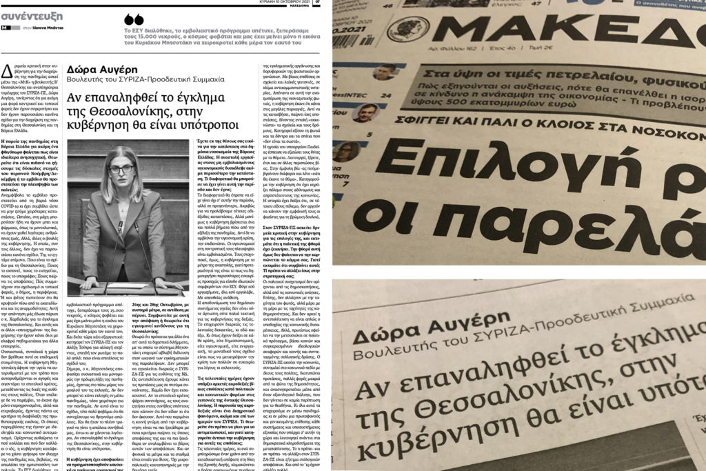 Δριμεία κριτική στην κυβέρνηση για την διαχείριση της πανδημίας ασκεί μέσω της ΜτΚ η βουλευτής Β’ Θεσσαλονίκης και αναπληρώτρια τομέαρχης του ΣΥΡΙΖΑ-ΠΣ, Δώρα Αυγέρη, τονίζοντας ότι για ακόμη μια φορά κεντρικοί και τοπικοί φορείς δεν έχουν συγκροτήσει και δεν έχουν παρουσιάσει κανένα σχέδιο για την διαχείριση της πανδημίας στη Θεσσαλονίκη και τη Βόρεια Ελλάδα.